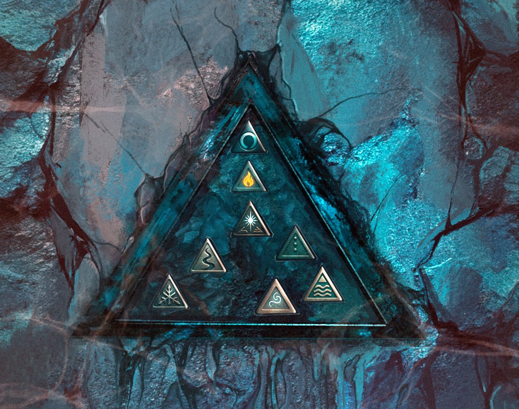 Clan & Habitat Symbols – Earth, wave, wind, river, ice, crater-fire, and light. These represent the seven clans and their caves, but also function as habitat markers for key ecosystems seeded on Thalassa.